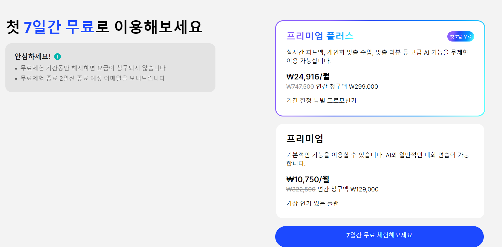 단, 회원가입을 하고 프리미엄 또는 프리미엄 플러스로 결제를 해야 7일간 무료체험이 제공됩니다.