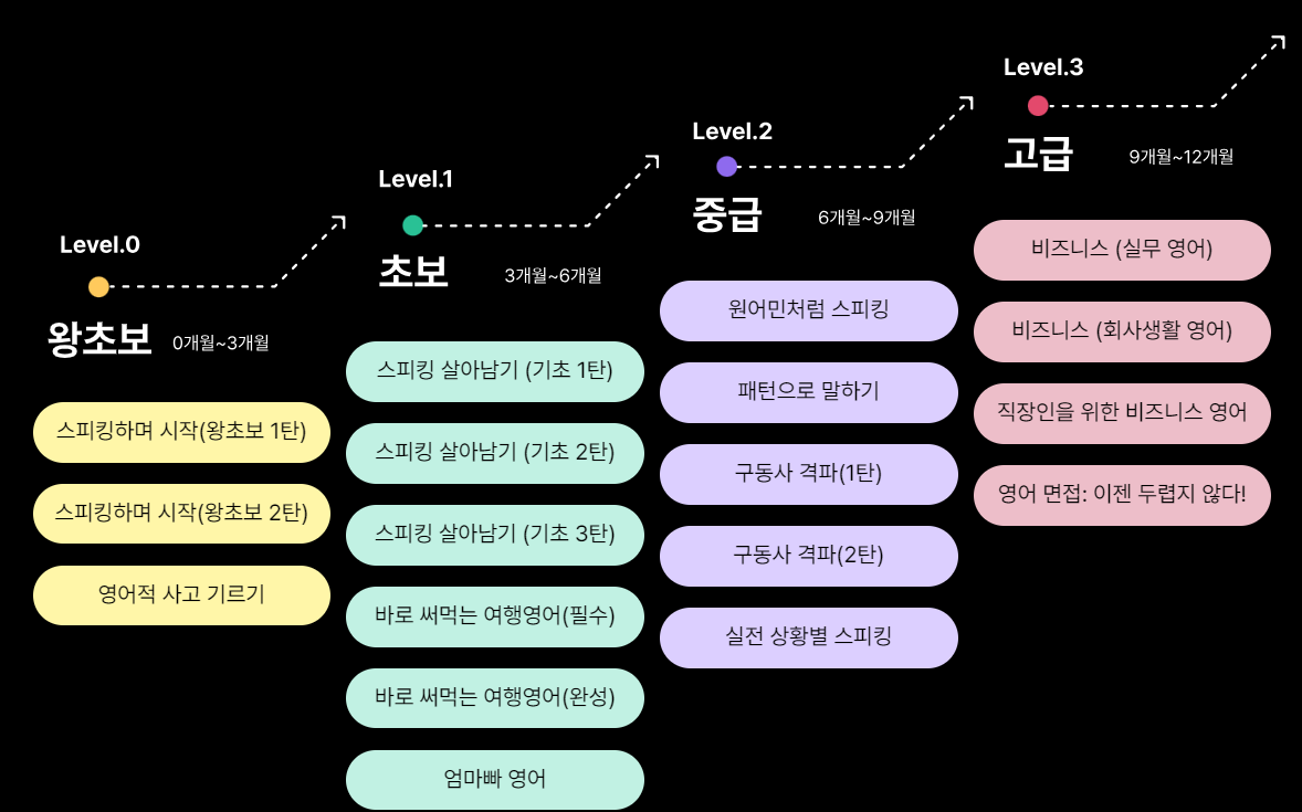상황별/목적별 수업: 영어, 여행 영어, 비즈니스 영어 등 학습자의 상황과 목적에 따른 수업을 제공합니다.