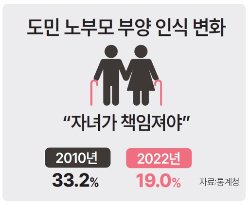 경기도에서도 유사한 경향이 나타났습니다. 2010년 기준으로 도민의 33.2%가 가족이 노부모를 부양해야 한다고 생각했으나, 2022년 조사에서는 이 비율이 19%로 떨어졌습니다. 대신 '가족·정부·사회가 함께 돌봐야 한다'는 인식은 50.7%에서 64.7%로 상승했습니다. 이는 이제 노부모 부양의 책무가 가족에만 국한되지 않고, 정부와 사회가 함께 역할을 분담해야 한다는 점을 시사합니다.