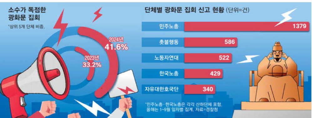 서울광장은 주말마다 집회와 시위로 가득 차며 시민들의 일상에 큰 영향을 미치고 있습니다. 현 정권에 반발하는 진보 진영과 이를 수호하려는 보수 진영이 맞불 집회를 열고 서로 대치하는 상황이 반복되고 있습니다. 이러한 갈등은 경찰과의 물리적 충돌로 이어지기도 하며, 결국 광장은 갈등의 공간으로 변질되고 있습니다.