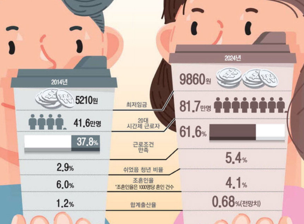 최근 10년 동안 최저임금이 두 배 가까이 상승하면서 한국의 노동 시장은 큰 변화를 겪고 있습니다. 2014년 최저임금은 5210원이었으나, 2025년에는 1만 30원으로 오르게 됩니다. 이러한 급격한 상승은 청년층의 아르바이트와 비정규직 근로 형태에 큰 영향을 미치고 있으며, 이는 결국 국가 발전에 부정적인 영향을 미치고 있습니다. 이번 포스팅에서는 최저임금 상승이 청년 일자리에 미친 영향과 그로 인해 발생하는 문제들을 살펴보겠습니다.