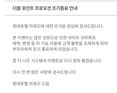 롯데호텔은 "많은 성원으로 인한 사이트 과부하로... 부득이하게 조기 종료하게 됐다"고 밝혔습니다. 이러한 커뮤니케이션은: