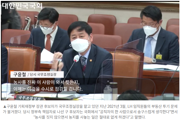 2021년 3월 LH 임직원 부동산 투기 사건이 터졌을 때, 구 후보자는 국무조정실장으로서 국회 정무위원회에 출석했습니다. 그는 당시 "공직자의 한 사람으로서 송구스럽게 생각한다"며 "농사를 짓지 않으면서 농지를 사놓는 일은 절대로 없게 하겠다"고 강력히 다짐했습니다.