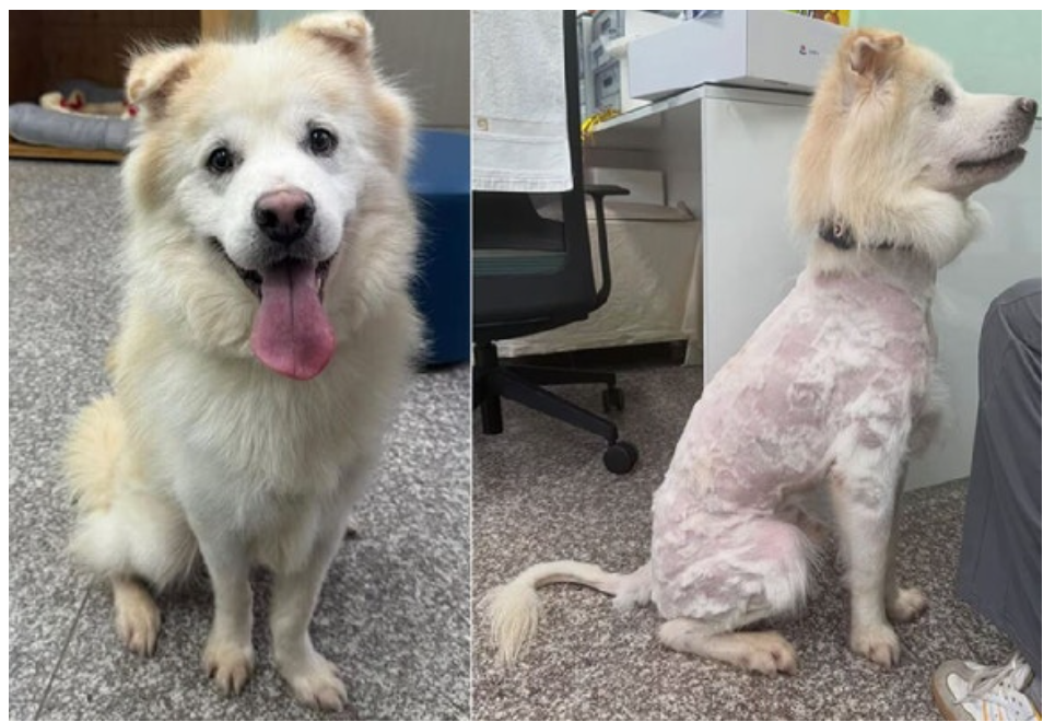 다음 날(20일) 오전, 센터로 돌아온 쿠노의 모습은 충격적이었습니다. 입양 전 자랑이었던 풍성하고 아름다운 털은 온데간데없이 사라져 있었고, 듬성듬성하게 정리되지 않은 털만이 몸에 남아있었습니다.