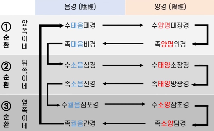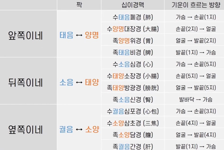 태음경과 양명경은 몸의 앞쪽으로 기운이 돌고 주로 손과 발의 1,2지를 통해 흐릅니다.